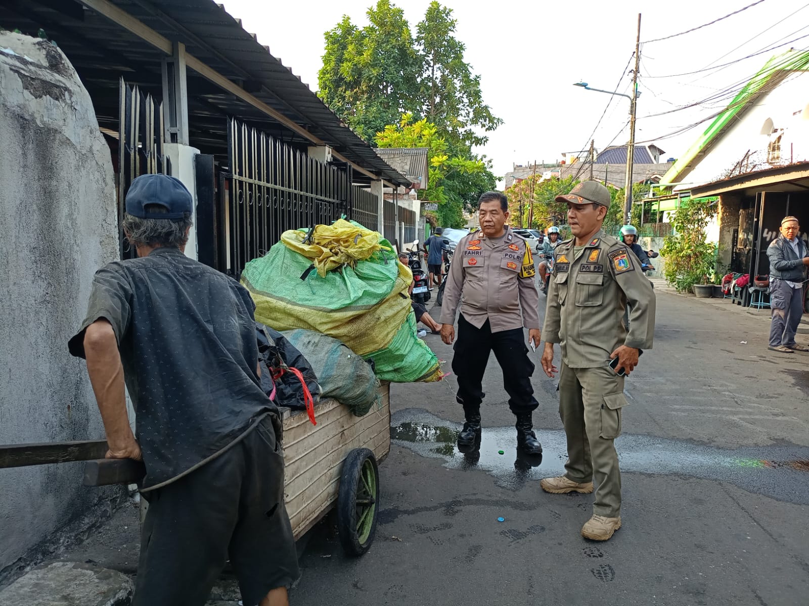 Bhabinkamtibmas Kelurahan Tanah Tinggi Aiptu Fahri mendampingi Kasatgaspol. PP., bapak Darmono, menerima pengaduan masyarakat di Jalan Tanah Tinggi wilayah RW 06 kelurahan Tanah Tinggi, Johar Baru Jakarta Pusat, dimana warga tersebut melaporkan banyak gerobak pemulung yang di tempatkan sembarangan mengganggu pengguna jalan.