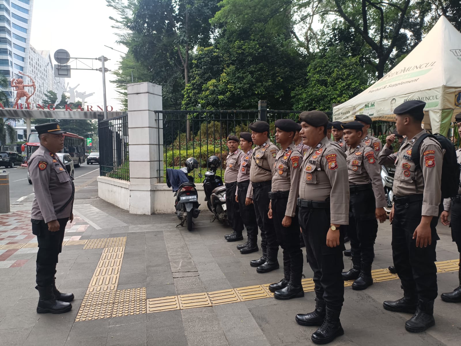 Kemudian berikan arahan dan penekanan pelajari dan kenali objek disekitaran pertigaan FX Sudirman yang menjadi tanggung jawab masih masih anggota sesuai dengan titik titik penempatan masing masinh anggota, jaga sikap tampang dan laksanakan tugas ini dengan penuh tanggung jawab, jangan sampai mendapat teguran sekecil apapun, tidak ada anggota yang menggunakan senpi.