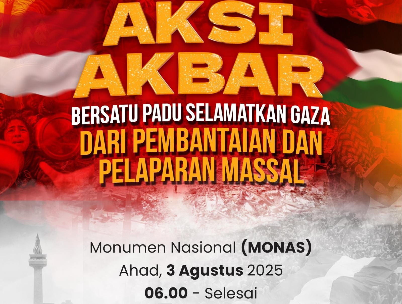Ratusan ribu warga dari berbagai elemen masyarakat Indonesia diperkirakan akan memadati kawasan Monumen Nasional (MONAS) dalam Aksi Akbar “Bersatu Padu Selamatkan Gaza”, pada Ahad, 3 Agustus 2025 mendatang, mulai pukul 06.00 WIB.