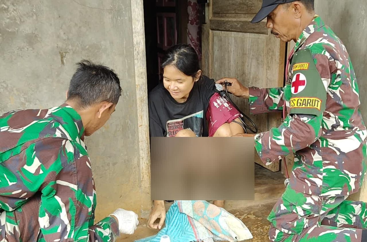 Wujud kepedulian terhadap kesehatan masyarakat, anggota tim kesehatan Satgas TNI Manunggal Membangun Desa (TMMD) di Desa Pamulihan, Kecamatan Situraja, Kabupaten Sumedang, turun langsung membantu menangani luka warga yang menderita diabetes, Senin (12/05/2025)