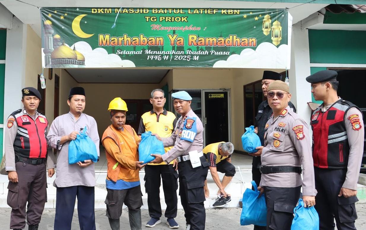 Personel Polres Pelabuhan Tanjung Priok melaksanakan kegiatan bakti sosial di Masjid Baitul Latif KBN Pelabuhan Tanjung Priok, Jumat (7/3/2025).