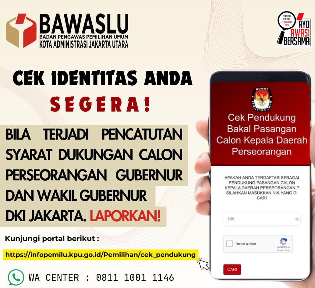 Jakartabersahabat.com | Bawaslu Jakarta Utara hari ini resmi membuka posko pengaduan untuk menangani laporan masyarakat mengenai pencatutan data KTP yang digunakan untuk mendukung calon perseorangan gubernur dan wakil gubernur, Dharma Pongrekun-Kun.
