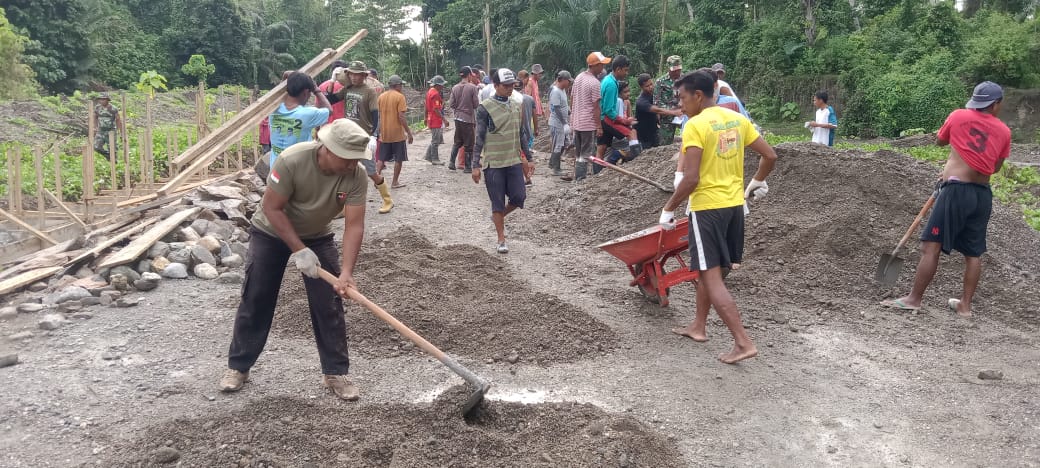 Pekerjaan ini dilakukan dengan penuh semangat meskipun mengharuskan personel Satgas TMMD dan warga untuk memikul air dengan tong menuju tempat adukan semen. Meskipun tugas tersebut terasa berat, tidak ada kata menyerah bagi mereka. “Kami mengisi air ke dalam tong yang berada dekat adukan semen agar memudahkan proses pencampuran bahan adukan rabat beton. Meskipun terik matahari sangat panas, kami tetap semangat dan tidak merasa kesulitan,” ujar salah seorang personel Satgas TMMD.