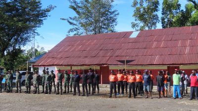 Komandan Satuan Tugas (Dansatgas) TNI Manunggal Membangun Desa (TMMD) Ke-124 Kodim 1710/Mimika Letkol Inf M. Slamet Wijaya, S. Sos., M. Han., M.A. memimpin apel pagi sebelum melanjutkan pekerjaan di lokasi kegiatan TMMD, Kampung Pigapu, Distrik Iwaka, Kab. Mimika, Jumat (09/5/2025).