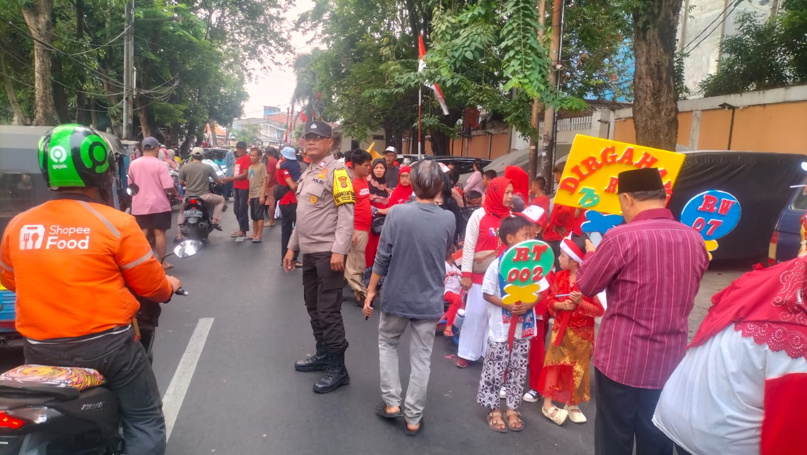 jakartabersahabat.com // Dalam rangka memperingati HUT RI Ke 79 Aiptu Sunarto selaku Bhabinkamtibmas Kelurahan Johar Baru membantu pengamanan warganya dalam rangka kegiatan Karnaval di Jalan Percetakan Negara II RW 07 Kelurahan Johar Baru, Kecamatan Johar Baru Jakarta Pusat. Sabtu (24/08/2024).