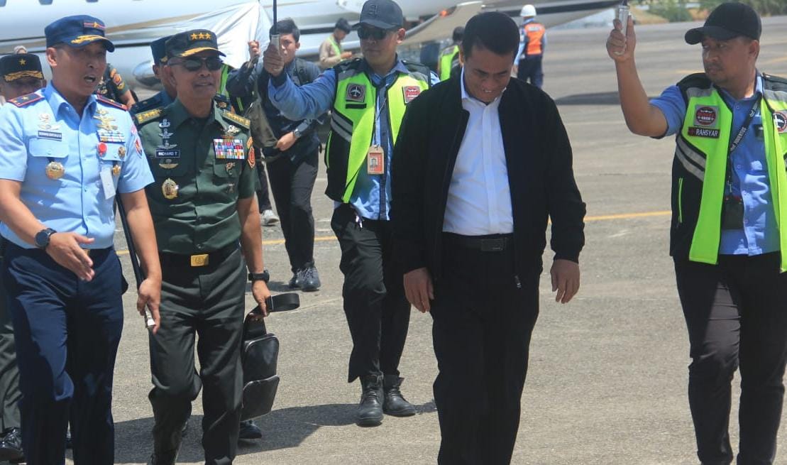 Komandan Lanud Sultan Hasanuddin, Marsma TNI Bonang Bayuaji G., S.E., M.M., CHRMP., menyambut kedatangan Menteri Pertanian (Mentan) RI, Dr. Ir. H. Andi Amran Sulaiman, M.P., dan Kepala Staf Umum (Kasum) TNI Letjen TNI Richard Tampubolon beserta rombongan di Lanud Sultan Hasanuddin, Makassar, Rabu (9/10/2024).