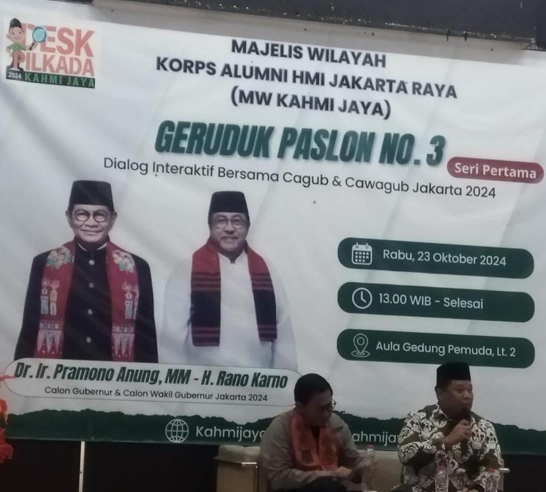 Desk Pilkada Majelis Wilayah Kahmi Jakarta Raya (MW KAHMI JAYA) melaksanakan kegiatan GERUDUK Pasangan Calon Gubernur dan Wakil Gubernur DKI Jakarta terhadap semua Pasangan Calon Gubernur dan Wakil Gubernur DKI Jakarta tahun 2024.