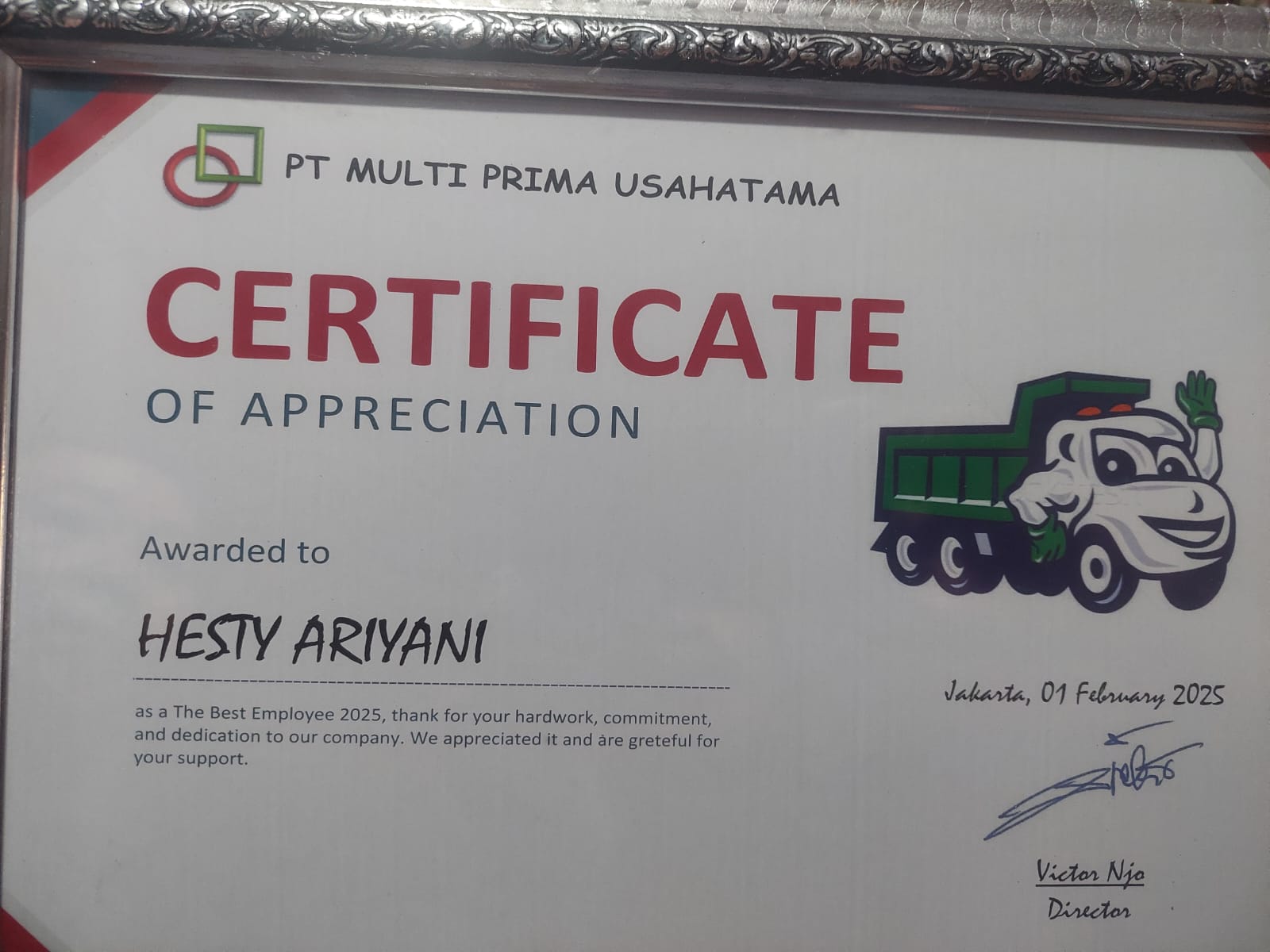 Penghargaan juga diberikan untuk karyawan terbaik tahun 2025 PT.MPU. Award ini diraih oleh Hesty Ariyani yang merupakan karyawan senior yang mulai bekerja pada tahun 2003.