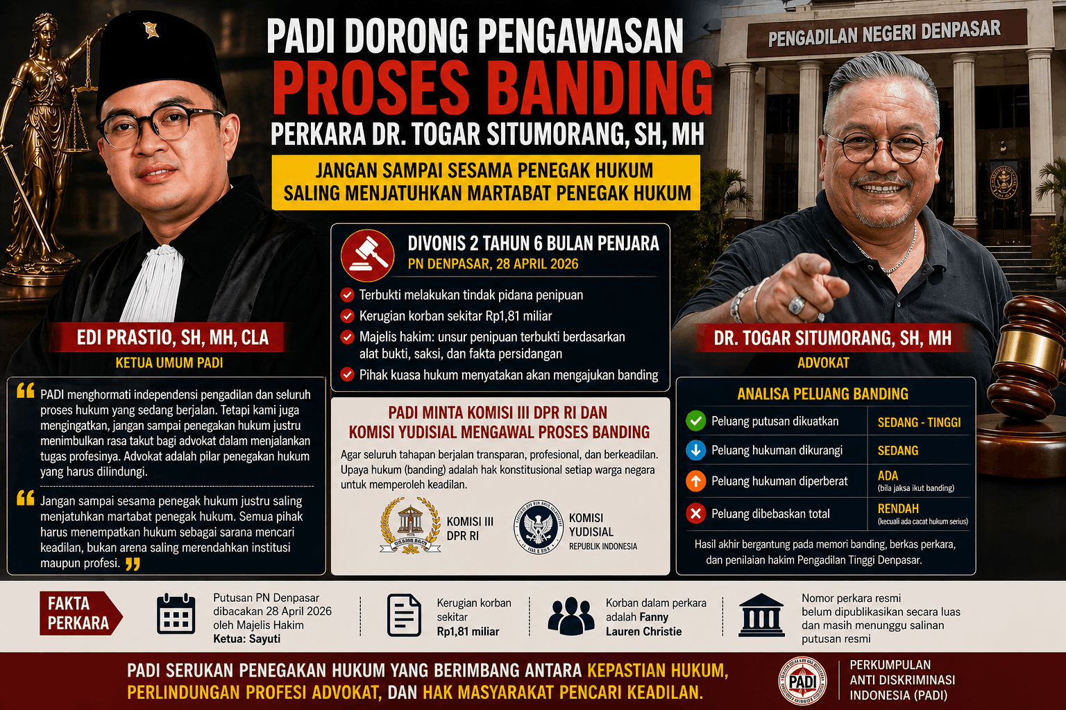Ketua Umum Perkumpulan Anti Diskriminasi Indonesia (PADI), Edi Prastio, SH, MH, CLA, menyoroti proses hukum lanjutan berupa banding dalam perkara yang menjerat DR. Togar Situmorang, SH, MH.
