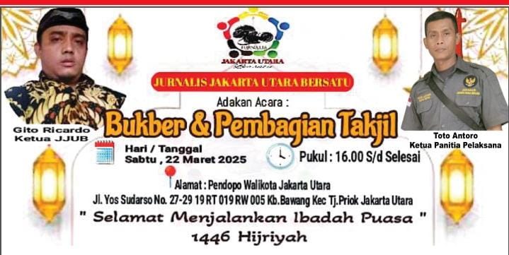 Acara bukber & pembagian takjil yang di inisiasi oleh ketua panitia pelaksana acara Toto Antoro sekaligus wakil ketua 2 JJUB, diadakan di pendopo walikota jakarta utara. Jalan yos Sudarso no. 27 – 29 Rt/Rw 019/05 Kelurahan kebon bawang kecamatan tanjung Priok jakarta utara.