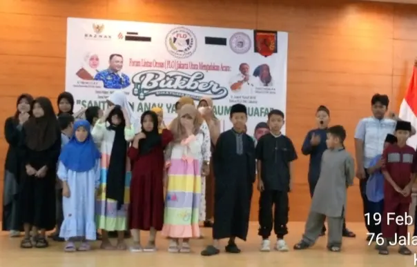 Forum Lintas Ormas (FLO) Jakarta Utara menggelar kegiatan santunan bagi anak yatim dan kaum dhuafa yang dirangkaikan dengan buka puasa bersama di Balai Yos Sudarso Lantai 3, Kantor Wali Kota Jakarta Utara, Kamis (19/2/2026).
