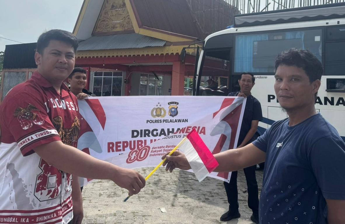 Dengan semangat cinta tanah air dan Nasionalisme, personil sat lantas polres Pelalawan membagikan bendera Merah Putih kepada peserta perpanjangan uji SIM.