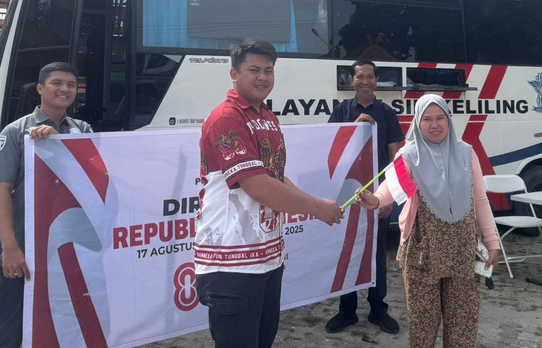 Dengan semangat cinta tanah air dan Nasionalisme, personil sat lantas polres Pelalawan membagikan bendera Merah Putih kepada peserta perpanjangan uji SIM.