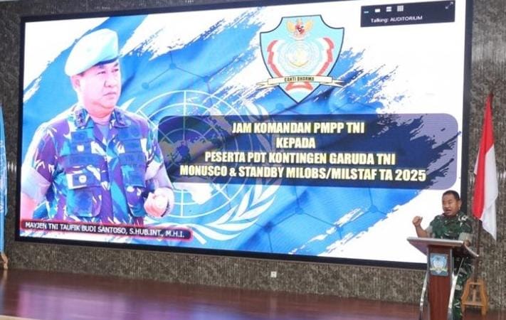 Kamis, (24 April 2025) – Komandan PMPP TNI Mayjen TNI Taufik Budi Santoso, S.Hub.Int., M.H.I. memberikan pembekalan kepada peserta Pre Deployment Training (PDT)/Pratugas Satgas TNI Kontingen Garuda (Konga) MONUSCO dan standby Milobs/Milstaf TA 2025 di Auditorium PMPP TNI, Sentul, Bogor, Senin (21/04/2025).