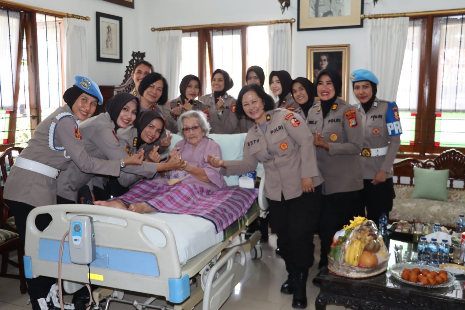 Dalam suasana penuh kekeluargaan, para Polwan mempersembahkan bingkisan sebagai simbol penghormatan dan rasa terima kasih kepada Ibu Mery Hoegeng atas dukungan dan pengorbanan yang telah diberikan selama suaminya bertugas di institusi kepolisian.