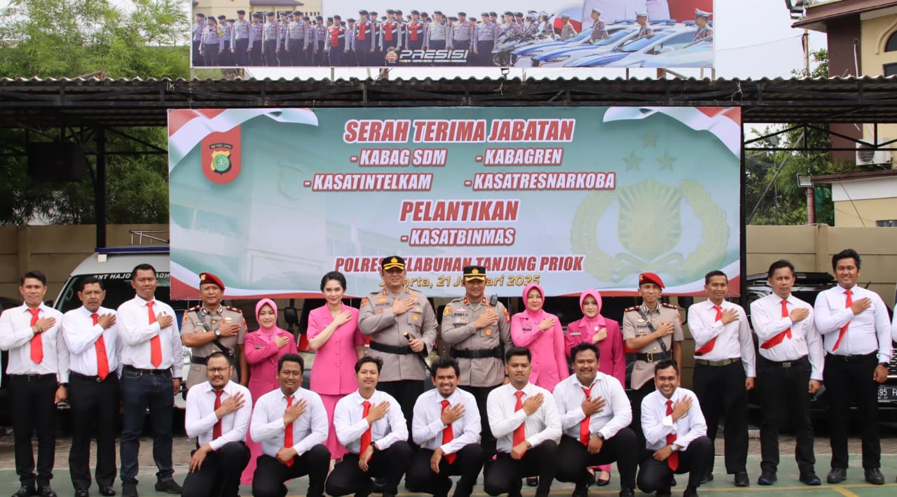 Kapolres Pelabuhan Tanjung Priok AKBP Dr. Martuasah H. Tobing, S.I.K., M.H., memimpin serah terima jabatan (Sertijab) Kabag SDM, Kabagren, Kasatreskrim, Kasatresnarkoba, Kasatintelkam dan Pelantikan Kasatbinmas Polres Pelabuhan Tanjung Priok bertempat di Lapangan Presisi Polres Pelabuhan Tanjung Priok, Selasa (21/01/2025).
