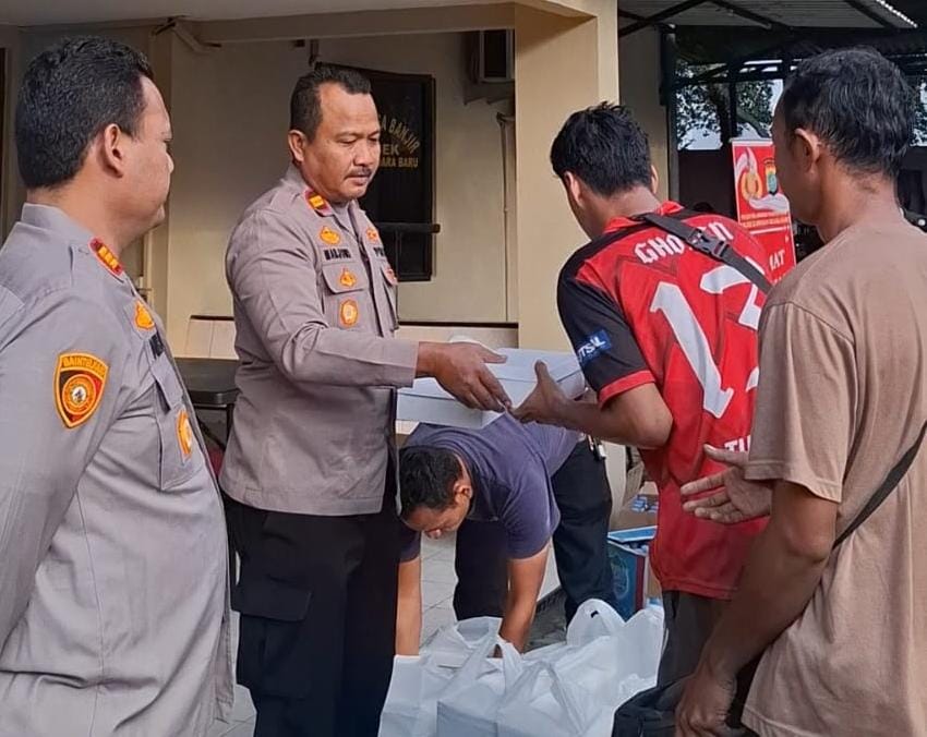 Polsek Kawasan Muara Baru Polres Pelabuhan Tanjung Priok kembali lagi melaksanakan kegiatan Berbagi Kebahagiaan dengan membagikan 200 paket makanan siap santap kepada pedagang ikan, ojeg, sopir, kernet, petugas kebersihan, buruh di Pelabuhan Muara Baru yang akan memasuki dan keluar Pos Pintu Utama Pelabuhan Muara Baru yang melewati depan Polsek Kawasan Muara Baru, Kamis (6/02/2025).