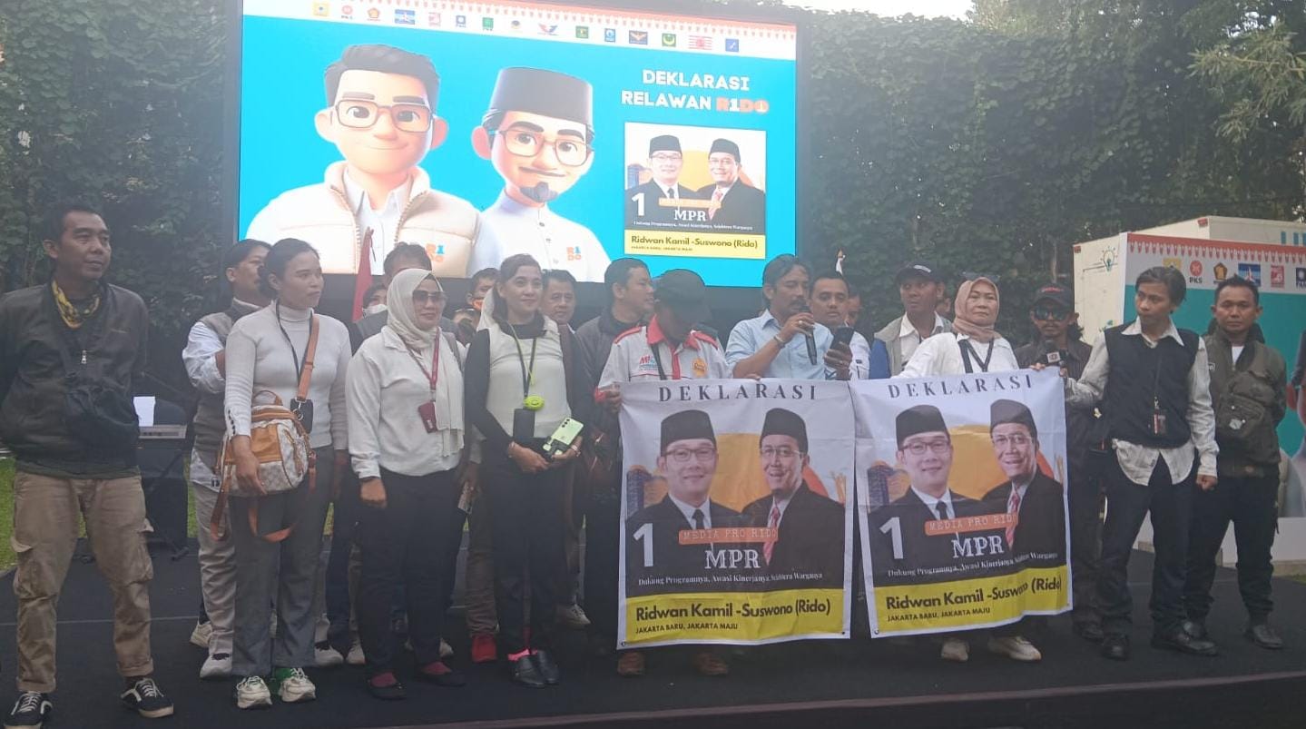 Media Pro RIDO (MPR) menyelenggarakan deklarasi gabungan tujuh organ relawan yang mendukung pasangan Ridwan Kamil – Suswono dalam Pilgub DKI Jakarta mendatang. Acara ini berlangsung di sekretariat bersama dikawasan Cikini, Jakarta Pusat, Minggu 27 Oktober 2024, pukul 15.30 WIB.