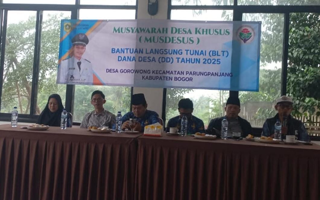 Pada hari Kamis, tanggal 17 April 2025, Desa Gorowong Kacamatan Parungpanjang Kab.Bogor Jawa Barat mengadakan Musyawarah Desa Khusus (Musdesus) untuk membahas dan menetapkan penerima Bantuan Langsung Tunai (BLT) Dana Desa tahun 2025. Acara ini berlangsung di Aula Desa Gorowong, mulai pukul 08.00 WIB hingga selesai.