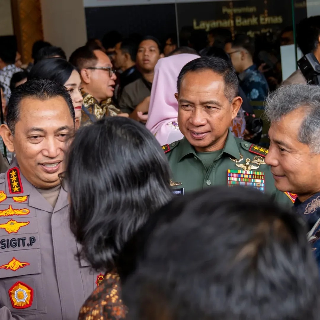 (Puspen TNI). Panglima TNI Jenderal TNI Agus Subiyanto bersama Kapolri Jenderal Pol. Listyo Sigit Prabowo menghadiri peresmian Layanan Bank Emas Pegadaian dan Bank Syariah Indonesia oleh Presiden RI Prabowo Subianto, bertempat di The Gade Tower, Senen, Jakarta Pusat, Rabu (26/02/2025).
