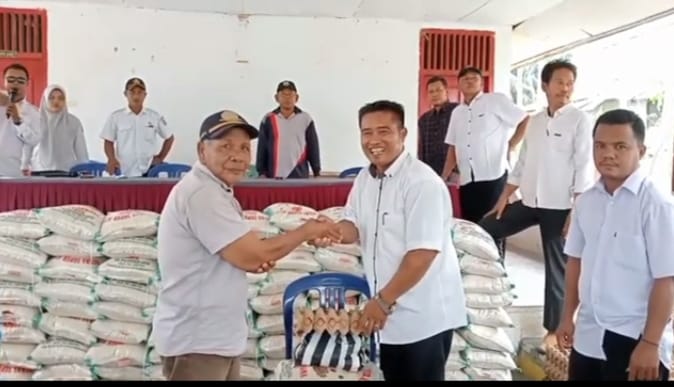 Kepala Desa Bagan Limau kecamatan Ukui Syarifuddin sekaligus pemilik beserta pengurus DO SF, berbagi paket sembako kepada Warga di Aula Desa Bagan Limau Kecamatan Ukui Kabupaten Pelalawan provinsi Riau pada Rabu 22 Januari 2025.