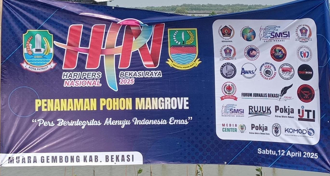 Puluhan wartawan mewakili dari berbagai organisasi pers di Kota Bekasi maupun Kabupaten Bekasi, dalam rangka rangkaian kegiatan acara memperingati Hari Pers Nasional (HPN) tahun 2025, Wartawan Bekasi Raya menggelar aksi peduli lingkungan dengan melakukan penanaman pohon Mangrove di kawasan pesisir Pantai Bahagia Kecamatan Muara gembong, Kabupaten Bekasi Provinsi Jawa Barat pada, Sabtu (12/4/2025).