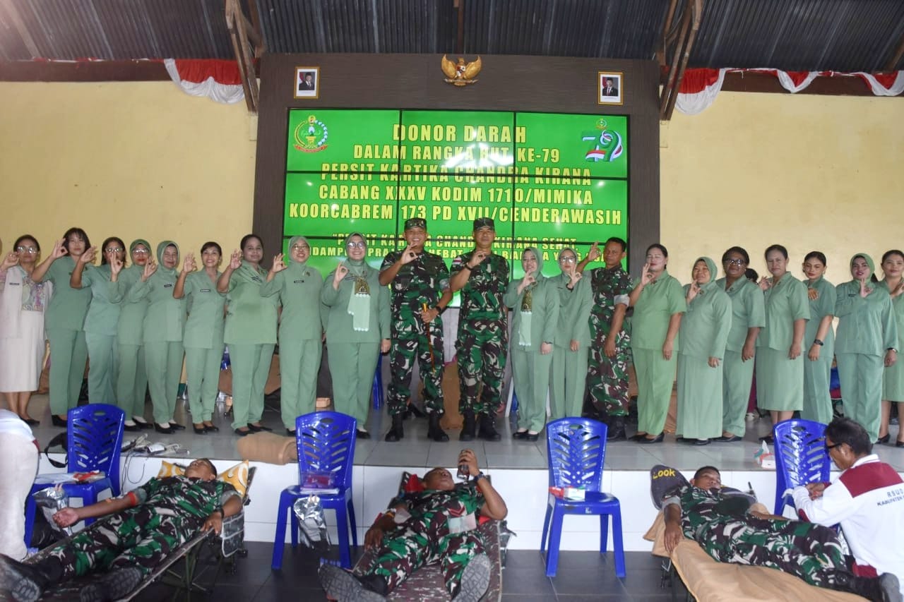 Dalam rangka memperingati HUT Ke-79 Persit Kartika Chandra Kirana, Kodim 1710/Mimika bersama Satuan TNI-Polri menggelar acara donor darah, bertempat di Aula Denkav-3/SC, Distrik Kuala Kencana, Kabupaten Mimika, Kamis (13/02/2025). Kegiatan tersebut dihadiri sekitar 200 orang terdiri dari Prajurit TNI, Polri dan anggota Persit Kartika Chandra Kirana, PIA Ardhya Garini dan Jalasenastri serta Bhayangkari.