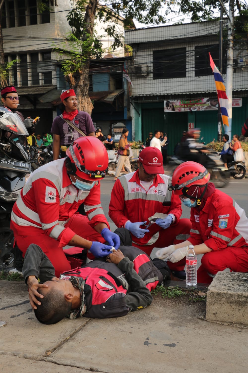 PMI hadir untuk memberikan pertolongan pertama, evakuasi medis, serta pelayanan darurat kesehatan bagi semua pihak yang membutuhkan, baik peserta aksi, masyarakat sekitar maupun aparat yang bertugas, ujarnya
