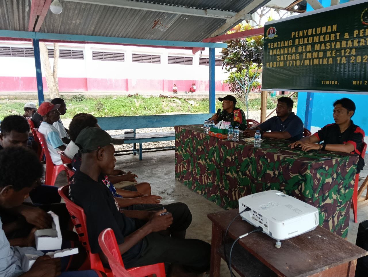 Satuan Tugas TNI Manunggal Membangun Desa (Satgas TMMD) Ke-124 Kodim 1710/Mimika menggelar kegiatan penyuluhan hukum dengan tema “Pencegahan Kekerasan dalam Rumah Tangga (KDRT) dan Peranan Hukum dalam Kehidupan Masyarakat” di Kampung Pigapu, Distrik Iwaka, Kab. Mimika. Kamis (22/5/2025).