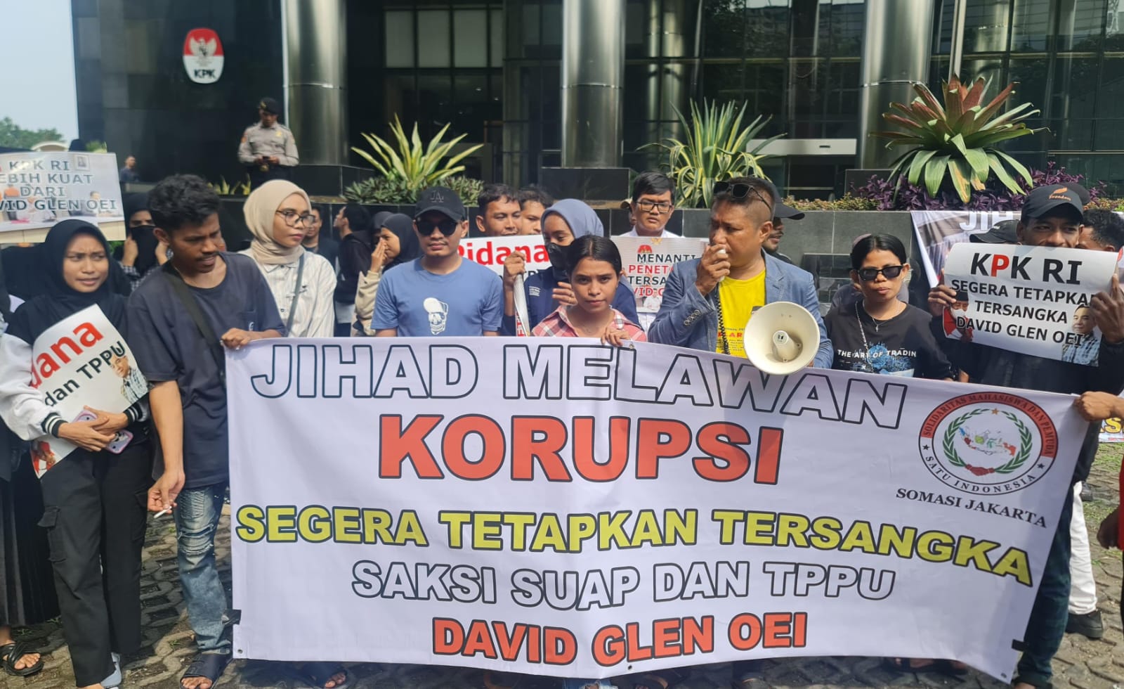 Masa aksi hadir dengan spanduk bertuliskan “Jihad Melawan Korupsi” sambil membawa poster-poster yang mendesak KPK segera tetapkan David Glen Oei sebagai tersangka.