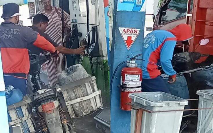 Warga mengeluhkan antrian panjang dan kesulitan mendapatkan solar, sementara para “pelansir” dengan motor berjerigen hilir mudik mengisi bahan bakar.